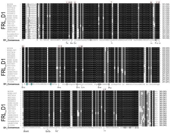 Far red light (FRL)-D1 protein sequence alignment supported by phylogenetic analysis in Figure 1. The specific conserved sites of FRL-D1 are highlighted by red-framed boxes. The aligned sequence lengths are labeled as ‘numbers (numbers)’ at the end of each sequence. The numbers outside parentheses are aligned sequence lengths matching the D1_consensus (unaligned gaps were removed), which is the number used in the models. The numbers inside parentheses represent the original length. The D1_consensus sequence surrounding the Mn4CaO5 cluster is highlighted in square boxes and bold fonts. The residues interacting with Pheo a in the D1_consensus sequence are highlighted with blue-colored circles. The D1_consensus sequence was generated by Genedoc based on 50 typical D1 protein sequences. The conserved residues from 18 FRL-D1 sequences are highlighted with red-square boxes on top of the alignments, and corresponding amino acid residues are numbered under the D1_consensus sequence. The numbers in the D1_consensus represent the conservative substitutions: 2 = Q/E; 3 = S/T; 5 = MFY; 6 = F/I/L/M/V.