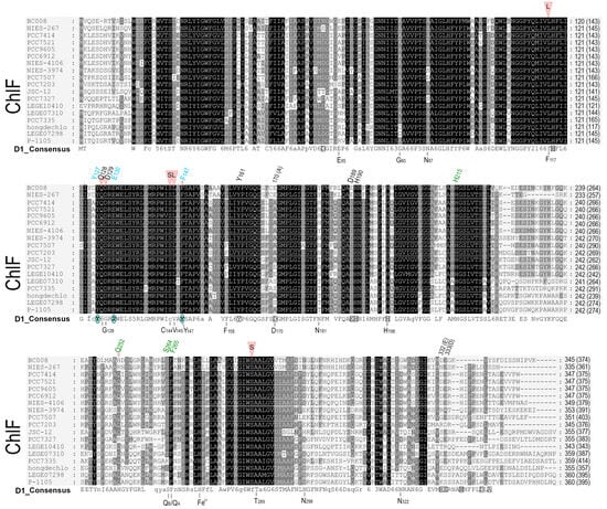 ChlF protein sequence alignment supported by phylogenetic analysis in Figure 1. The specific conserved sites of ChlF are highlighted by red triangles. The aligned sequence lengths are labeled as ‘numbers (numbers)’ at the end of each sequence. The numbers outside parentheses are aligned sequence length matches with D1_consensus (removed unaligned gaps), which is the number used in the models. The numbers inside parentheses represent the original length. The D1_consensus sequence surrounding the Mn4CaO5 cluster is highlighted with square boxes and bold fonts labeled in the D1_consensus sequences. The noticeable changes in amino acid residues at the positions associated with the Mn4CaO5 cluster are labeled on the top of aligned ChlF sequences (black-colored fonts). The residues interacting with Pheo a in the D1_consensus sequence are highlighted by blue-colored circles, and their corresponding sites are labeled on top of the aligned ChlF sequences in blue-colored fonts. The amino acid residues surrounding the QB site (as presented in Section 3.4 below) are labeled on top of the aligned ChlF sequence, indicated as green-colored fonts. The D1_consensus sequences were generated by Genedoc based on 50 typical D1 protein sequences. The specific amino acid residues of ChlF are marked in a pink triangle on top of the alignment, and the corresponding amino acid residues are numbered under the D1_consensus sequence. The numbers in the D1_consensus represent the conservative substitutions: 2 = Q/E; 3 = S/T; 5 = MFY; 6 = F/I/L/M/V.