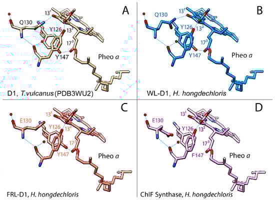 Modeling of the pheophytin a (Pheo a) binding region in WL-D1, FRL-D1, and ChlF of H. hongdechloris. T. vulcanus (PDB 3WU2) was used as a template. The amino acid positions known to form H-bonds (light blue lines) with Pheo a: Y126 (Tyr-O•••H•••O=C132-Pheo a); Q130/E130 (N-H or O-H) (Q-N•••H•••O=C131-Pheo a) or (E-O•••H•••O=C131-Pheo a), and Y147 (Tyr-O•••H•••O=C173-pheo a) are included to compare with the predicted H-bonds. (A) The crystal structure of D1 of T. vulcanus (PDB 3WU2) was used as a template for the modeled structure. (B–D) represent models of the Pheo a binding regions of WL-D1, FRL-D1, and ChlF synthase, respectively. Dark blue rods, nitrogen atoms; red rods, oxygen atoms; and dotted light blue lines, H-bonds. Note: FRL-D1 and ChlF synthase have E130, which may have H-bonds with the 131-keto of Pheo a, and these bonds might be stronger than Q130 (Table S3).