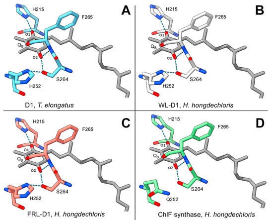 The typical D1 subunit has three H-bonds with two keto groups of QB: H215-N-H•••O=keto QB−O1, S264-O-H•••O=keto QB−O2, and F265N-H•••O=keto QB−O2. Additionally, S264 forms an H-bond with H252, H252-N-H•••O-S264 (Figure 5). Modeling of FRL-D1 and WL-D1 of H. hongdechloris simulated the H-bonds of H252-N-H•••O-S264 and the QB coupling environments were potentially unchanged (Figure 5). H252 protonation supports the protonation of QB to form QBH2, an important electron transfer towards oxygen-evolving activities []. However, ChlF has a H252Q substitution that is known to affect electron transfer (Figure 5D). The lack of an H-bond between Q252 and S264 inhibits the putative protonation of QB and conversion of QBH2 [], and mutant H252Q exhibitsed rapid electron transfer from QA− to QB []. The common substitution of H252Q (Figure 5D) implies that there is a more flexible structure in this region because H-bond formation should precede protonation to preserve some of the H-bonds supporting QB.