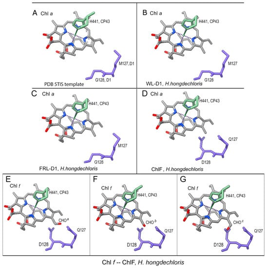 Position of the QD motif of ChlF compared with conserved MG residues from other D1 proteins. (A) Template 5TIS; (B) modeled H. hongdechloris WL-D1; (C) modeled H. hongdechloris FRL-D1; (D) modeled H. hongdechloris ChlF; and (E–G) Chl a was replaced with Chl f at the position of the modeled ChlF. The C2-CHO group of Chl f was shown at different orientations. (E), position a; (F), position b; and (G), position c, of the oxygen atom of CHO. Chlorophyll molecular bonds are gray; residues 127 and 128 of D1 and D1 paralogs are purple-blue. The histidine (H441) of CP43 is in green. Dark blue rods, nitrogen atoms; red rods, oxygen atoms; dotted lines, H-bonds.