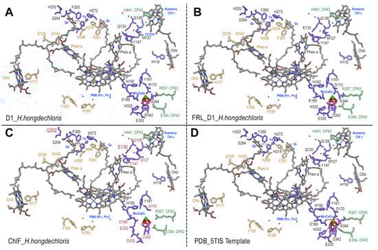Three-dimensional structural modeling was performed using Chimera version 1.14 [], https://www.cgl.ucsf.edu/chimera/download.html (accessed on 1 March 2020). The PSII structural data from Thermosynechococcus vestitus BP-1 (also named Thermostichus vulcanus) (PDB 5TIS and PDB 3WU2) (non-Chl f-producing cyanobacteria) were used as templates to simulate structural models of D1 paralogs from H. hongdechloris. The following Uniprot data were predicted: A0A1Z3HIN9, H. hongdechloris ChlF (XM38_010900); A0A1Z3HJ62, H. hongdechloris FRL-D1 (XM38_010770); A0A1Z3HKW5, H. hongdechloris WL-D1 (XM38_018880); and P51765, T. vulcanus D1. Note that Uniprot P51765 has a R279P substitution compared with Uniprot P0A444 (D1 of T. vulcanus). All stimulated structure models were minimized and optimized after adding H-bonds and the protonation states of conserved charged amino acid residues, such as histidine (H) and glutamic acid (E). All predicted models were refined using the Swissprot database (https://swissmodel.expasy.org, accessed on 1 March 2020) against the template file (5TIS.pdb). SWISS-MODEL allows the production of a 3D model of heteromeric complexes [], such as FRL-PSII complexes stimulated using PSII subunits from the FaRLiP cluster (FRL-PSII subunits). The individual 3D models of ChlF, FRL-D1, and WL-D1 of H. hongdechloris were used in place of D1 from T. vulcanus (PDB 5TIS). The heterodimers of D1/CP43/CP47/D2 using WL-PSII and FRL-PSII subunits from H. hongdechloris were predicted against the PDB 5TIS template.
