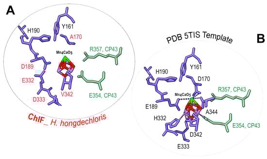 Detailed amino acid ligands surrounding the Mn4CaO5 cluster. (A) A detailed model of ChlF from H. hongdechloris (WP 225889441) and (B) structural details of the PDB 5TIS template. The conserved (black fonts) and different (red fonts) amino acids surrounding the Mn4CaO5 cluster. ChlF residues are in purple-blue. CP43 amino acids are in green. The red rods represnt the Mn in the Mn4CaO5 cluster; the green rod is the Ca in the Mn4CaO5 cluster; and the dotted lines are H-bonds.