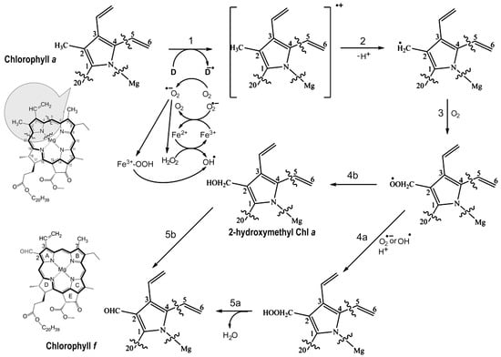 Oxidation of a methyl group to a formyl group is a difficult task because CH3 is a chemically stable side group. Free radical formation can be specifically involved [,,]. Pheo a on the acceptor side of PSII may form a singlet oxygen or hydroxyl free radical. Figure 4 suggests that the specific residues of F147 in ChlF cause a loss of the H-bond at C173-Pheo a and a potential slower electron transfer rate, although there is no available experimental data, such as a constructed D1 mutant of Y147F (Figure 4). Non-heme iron may also contribute to the formation of singlet oxygen or hydroxide radicals in the presence of light and aerobic conditions [,,,]. The inhibition of Chl f synthesis by DCMU implied that electron transports by the primary and secondary acceptors Pheo a, QA, and QB were involved in the reaction chemistry []. As is known in PSII, the dominant pathway of charge recombination goes through the radical pair of [P680+/Pheo a−], and an additional non-radiative pathway could proceed through repopulation of P*680 from 1[P680+/Pheo a−], which was observed in D1 mutant Q130E in Synechocystis PCC 6803 []. We proposed the reaction scheme of Chl (Chlide) f synthesis from Chl (Chlide) a via free radical chemistry (Figure 9). Pheo a excitation in an oxygenated environment produces an anion radical (D−•) via singlet and triplet excited states coupled to electron donation by Chl a. The cation-radical of the Chl a methyl group is produced via deprotonation. This cation-radical reacted with dioxygen to form a peroxide, which was further oxidized to superoxide or hydroxyl radical (Figure 9, step 4a) via reductants Pheo a (−610 mV) or QA− (−80 mV) [,].