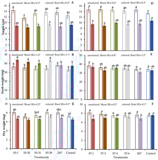 Effects of inoculation with putative seed bacterial endophytes previously selected and Herbaspirillum seropedicae strain Z67 (reference strain) on the growth of rice cv. INCA LP-5 (A–C) and cv. INCA LP-7 (D–F), 21 days post-inoculation (dpi) in in vitro conditions. The control treatment was the plants inoculated with the sterile TY medium. The data reported are the means of thirty sample replicates. Different letters mean that the difference between treatments is significant (Tukey HSD p < 0.05, n = 30). Uncolored bar represents the plant shoot; colored bar, plant root. SEx, standard errors of ANOVA; (*) significance values.