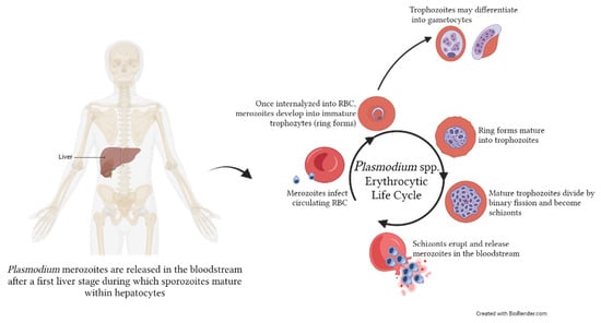 Malaria is one of the most prevalent vector-borne parasitic diseases worldwide, affecting, in 2021, an estimated 247 million people and responsible for 619,000 deaths, mainly occurring in young children in sub-Saharan Africa [25]. The vast majority of malaria deaths are due to the development of complications (severe malaria—SM) of an otherwise uncomplicated infection. SM can manifest as different syndromes that can develop individually or in combination, the most common of which are cerebral malaria (CM), severe malaria anaemia (SMA), and respiratory distress (RD) [26,27,28]. Five different Plasmodium spp. can cause the disease in the human host, i.e., P. falciparum, P. vivax, P. knowlesi, P. ovale and P. malariae, among which the first three have been reported to cause severe malaria [29,30,31], even though most SM cases are due to P. falciparum. The malaria parasite has a complex life cycle, starting in the liver of the intermediate human host following the bite of the infected mosquito and then progressing to the blood circulation, infecting specifically red blood cells (RBC) at different stages of differentiation (e.g., reticulocytes for P. vivax and mature erythrocytes for P. falciparum) and finishing in the definitive host (mosquito) [32]. A graphical representation of the intra-erythrocytic life cycle of Plasmodium spp. is reported in Figure 1.