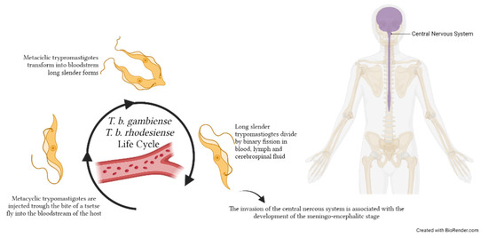 Human African trypanosomiasis, also known as sleeping sickness, is a NTD caused by the extracellular protozoan parasite Trypanosoma brucei, which is transmitted through the bite of an infected tsetse fly [105]. Two subspecies, T. b. gambiense and T. b. rhodesiense, can infect the human host, causing a disease that can be fatal if, when untreated, the parasite reaches the central nervous system [106] (Figure 4). This progression is much faster during an infection caused by T. b. rhodesiense. The two parasites are found only in sub-Saharan Africa, and their distribution is geographically separated since T. b. gambiense is diffused in Central and West Africa, while T. b. rhodesiense is found in East Africa [106]. T. b. gambiense is responsible for the majority (up to 92%) of the reported cases. The implementation of important control measures, including active and passive case finding, patients’ treatment and vector control, has led to a drastic reduction of the reported cases during the last decades—especially for T. b. gambiense—with less than 1000 cases reported annually in 2019 and 2020 [107], compared to 35,000 cases reported annually at the end of the 20th century [108].