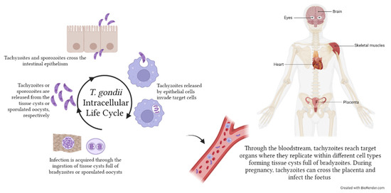 Toxoplasmosis is a zoonotic disease due to the intracellular apicomplexan parasite Toxoplasma gondii. Humans—as any warm-blooded animal—represent intermediate hosts, while felids are the only definitive hosts [114]. The human infection is acquired upon ingestion of oocysts or intracellular cysts present in contaminated soil/water or food, respectively [114]. T. gondii replicates within different mammalian cell types by endodyogeny [115]; in the human host, it forms cysts that can persist lifelong (Figure 5). Human toxoplasmosis is widespread worldwide, and two billion people are considered to be chronically infected globally [116,117], even though different strains of T. gondii may vary in virulence and geographical distribution [118]. In immunocompetent individuals, the infection is mostly asymptomatic or presents only weak symptoms during the first few weeks of infection. Serious and potentially life-threatening forms can, however, develop, namely congenital and cerebral toxoplasmosis. Congenital toxoplasmosis occurs when the first infection is acquired during pregnancy since the parasite can cross the placental barrier to infect the foetus, causing damages spanning from developmental impairment to miscarriage and stillbirth [119]. In immunosuppressed patients, particularly those with untreated HIV, a reactivation of a latent infection can cause brain lesions and encephalitis [120].