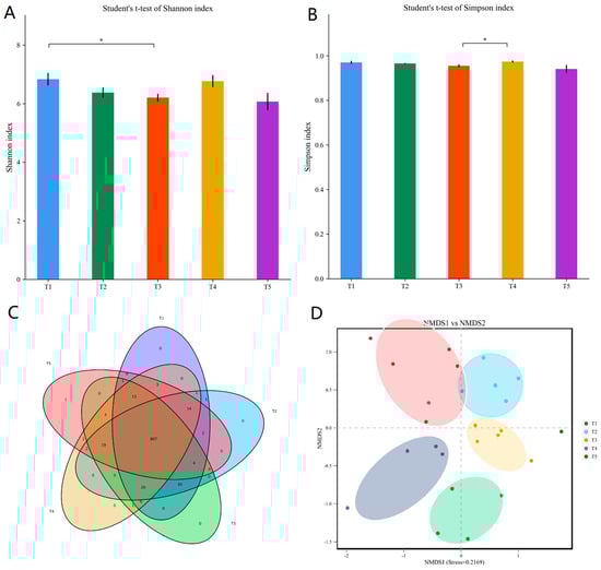 Diversity and community structure of the rumen microbiome in goats fed diets varying in the proportion of cassava foliage. T1, 100% king grass; T2, 25% cassava foliage silage with 75% king grass; T3, 50% cassava foliage silage with 50% king grass; T4, 75% cassava foliage silage with 25% king grass; T5, 100% cassava foliage. (A) Shannon diversity index. (B) Simpson diversity index. (C) Venn diagram of OTUs. (D) Non-metric multidimensional scaling (NMDS) analysis of the rumen microbiome. * Means significantly different (p < 0.05).