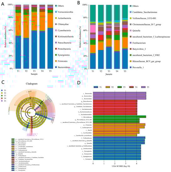 Microbial community composition (phylum, (A) and genus, (B)) and comparison of microbial communities (via the LEfSe tool) of rumen microbiomes in goats fed diets with varying proportions of cassava foliage (C,D). T1, 100% king grass; T2, 25% cassava foliage silage with 75% king grass; T3, 50% cassava foliage silage with 50% king grass; T4, 75% cassava foliage silage with 25% king grass; T5, 100% cassava foliage.