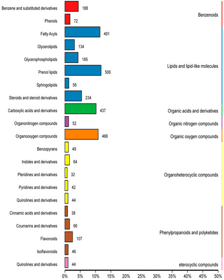 The metabolomic analysis yielded 4913 features. These were used as a batch query against the human metabolome database (HMDB) to annotate 4330 individual samples with identified features. The identified metabolites were further divided into eight superclasses and 20 categories (Figure 3) as follows: benzenoids (benzene and its substituted derivatives and phenol), eterocyclic compounds (quinolines and derivatives lipids and lipid-like molecules), lipids and lipid-like molecules (fatty acyls, glycerolipids, glycerophospholipids, prenol lipids, sphingolipids, steroids, and steroid derivatives), organic acids and derivatives (carboxylic acid and derivatives), organic nitrogen compounds (organonitrogen compounds), organic oxygen compounds (organooxygen compounds), organoheterocyclic compounds (benzopyran, indoles and derivatives, pteridines and derivatives, pyridines and derivatives, and quinolines and derivatives), phenylpropanoids and polyketides (cinnamic acid and derivatives, coumarin and derivatives, and flavonoids).
