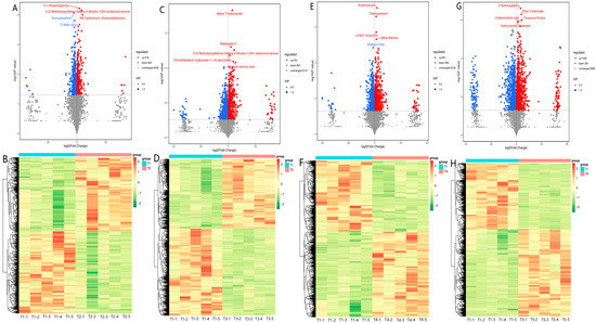 Comparative metabolomics analysis of goat rumens in animals fed diets with varying proportions of cassava foliage. T1, 100% king grass; T2, 25% cassava foliage silage with 75% king grass; T3, 50% cassava foliage silage with 50% king grass; T4, 75% cassava foliage silage with 25% king grass; T5, 100% cassava foliage. Volcano plots show the number of differentially expressed metabolites among treatments ((A), T1 vs. T2; (C), T1 vs. T3; (E), T1 vs. T4; (G), T1 vs. T5). Heat maps show the differences in metabolic profiles for goat rumens from different groups ((B), T1 vs. T2; (D), T1 vs. T3; (F), T1 vs. T4; (H), T1 vs. T5).