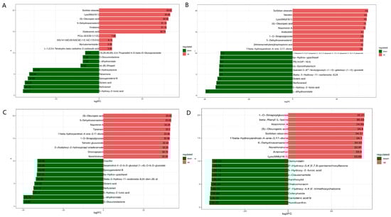 Fold changes in differentially expressed metabolites in goat rumens from animals fed diets with different amounts of cassava foliage ((A), T1 vs. T2; (B), T1 vs. T3; (C), T1 vs. T4; (D), T1 vs. T5). T1, 100% king grass; T2, 25% cassava foliage silage with 75% king grass; T3, 50% cassava foliage silage with 50% king grass; T4, 75% cassava foliage silage with 25% king grass; T5, 100% cassava foliage.