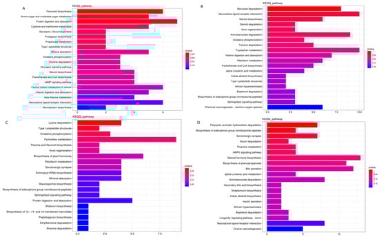 KEEG pathway enrichment analysis of the differentially expressed metabolites observed in goat rumens from animals fed diets with different amounts of cassava foliage ((A), T1 vs. T2; (B), T1 vs. T3; (C), T1 vs. T4; (D), T1 vs. T5). T1, 100% king grass; T2, 25% cassava foliage silage with 75% king grass; T3, 50% cassava foliage silage with 50% king grass; T4, 75% cassava foliage silage with 25% king grass; T5, 100% cassava foliage.