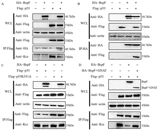 BspF attenuates the crotonylation modification of p53 by the GNAT domain and also interacts with p53. (A) The effect of BspF on the crotonylation of p53 and the interaction between BspF and p53 was detected by co-immunoprecipitation with anti-Flag-tag antibody; (B) with HA-tagged antibody, and WCL represents whole cell lysate; (C) with FLAG-tagged antibody. (D) The effects of BspF and BspFΔGNAT on the crotonylation of p53 were detected by co-immunoprecipitation.