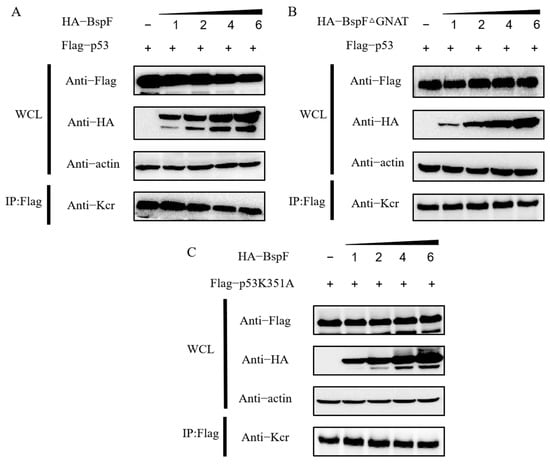 BspF affects p53K351 site crotonylation modification through its GNAT domain and affects p53 protein expression. (A) The effects of increasing BspF transfection dose on p53 protein expression and crotonylation modification were detected by Western blotting. (B) Western blotting was used to detect the effect of the increased transfection dose of BspFΔGNAT on p53 protein expression and crotonylation modification. (C) The effects of increasing BspF transfection dose on p53K351A protein expression and crotonylation modification were detected.