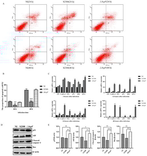 Caspase-3 is a key executor in apoptosis, and apoptosis is more pronounced when the expression level of Caspase-3 is improved []. Compared with Brucella 2308, the ΔbspF strain infection significantly increased the mRNA transcription level of Caspase-3 at 3, 12, 24, and 48 h after infection, and it also significantly increased the expression of cleaved-caspase-3 protein. As an apoptosis-inducing factor, AIF interacts with mitochondrial protein endonuclease G (EndoG) to cause the fragmentation of condensed DNA of the cell chromosomes and apoptosis of cells []. Compared with Brucella 2308, the transcription level of the AIF mRNA gene was significantly increased at 12, 24, and 48 h in 2308 ΔbspF-infected cells, and the expression of AIF protein was also significantly increased. As a pro-apoptotic protein, Bax is the main mediator of the mitochondrial apoptosis pathway. Compared with Brucella 2308, the mRNA transcription level of Bax was significantly increased at 12, 24, and 48 h after Brucella ΔbspF infection (Figure 3C), and the protein expression of Bax was also significantly increased (Figure 3D,E). These results indicated that BspF inhibits apoptosis. The data shown in the results of flow cytometry further support the notion that BspF assumes a critical role in inhibiting apoptosis, which demonstrated that the apoptosis of the cells infected with the Brucella ΔbspF strain was significantly higher after 24 and 48 h than the 2308 WT strain (Figure 3A,B).