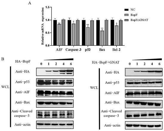 BspF inhibits the transcription and protein expression of apoptosis-related genes through its GNAT domain. (A) mRNA expression of apoptosis-related genes AIF, Caspase-3, p53, Bax, and Bcl-2 relative to β-actin. Each group had three replications. ** Indicates the significant difference between this group and the BspFΔGNAT group (p < 0.01); * indicates the significant difference between this group and the BspFΔGNAT group (p < 0.05). (B) In HeLa cells transfected with increasing doses of HA-BspF and HA-BspFΔGNAT, endogenous antibodies were used to detect changes in the levels of apoptotic markers.