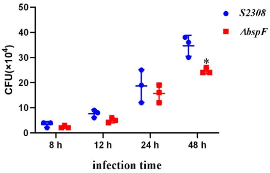 To determine whether the deletion of BspF affects the intracellular survival of Brucella, the number of CFUs was counted following infection, with Brucella abortus 2308 and 2308 ΔbspF. As shown in Figure 5, after 8 h and 12 h of infection, there was no significant change in the intracellular survival of 2308 and 2308 ΔbspF. At 24 h post-infection, the intracellular survival amount of the ΔbspF strain was lower than 2308WT, and the intracellular viability of the ΔbspF strain was significantly reduced (p < 0.05) at 48 h. The results suggested that a BspF deficiency inhibits the intracellular survival of Brucella and may act as an effector protein, playing an important potential virulence role.