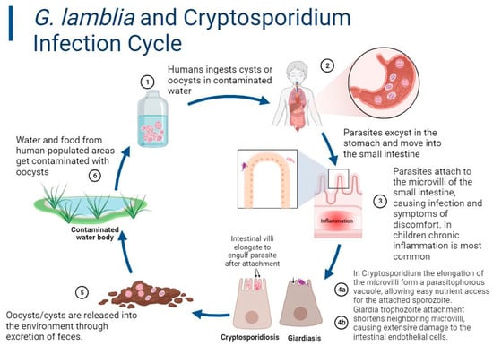 The primary way that Giardia initiates infection is typically through the ingestion of a Giardia cyst (Figure 1). The cyst is a non-motile Giardia oocyte that is resistant to harsh environmental conditions and can survive in water for 1–4 months until ingested by a mammalian host [55,65]. G. duodenalis’s zoonotic potential could also be problematic in HICs. Common household pets such as dogs and cats are known to be effective carriers of the parasite and raise the question of the safety of caring for untested pets in households with immunocompromised individuals and young children [66]. The ubiquitous nature of the infective G. duodenalis cysts around dog parks could complicate the control of the transmission from pet to pet. There is, however, conflicting evidence about whether exposure to pets poses a threat to humans. In several studies from New Zealand, exposure to infected dogs was not associated with an increased risk of giardiasis, while, in England, studies have suggested that household pets could be associated with an increased risk of disease [66]. Furthermore, an analysis of the literature data based on recent advances in molecular typing tools suggests that zoonotic giardiasis is not as common as previously acknowledged [67]. Nonetheless, cryptosporidiosis and giardiasis are of both human public health and veterinary importance.