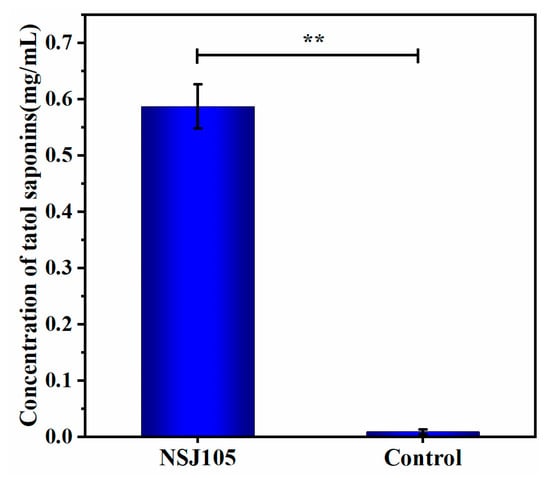 The oleanolic acid standard solution was prepared and detected for the standard curve shown in Figure S2. The correlation coefficients R2 (0.9973) exhibited good linearity. The optical density (OD) value at 544 nm of the fermentation extraction sample was measured, and then the total saponin concentration was calculated based on the standard curve. The extract of the NSJ105 fermentation was extracted and detected according to the ultraviolet spectrophotometry method. As depicted in Figure 4, the average total saponin concentration of the NSJ105 fermentation extract was 0.587 ± 0.039 mg/mL.