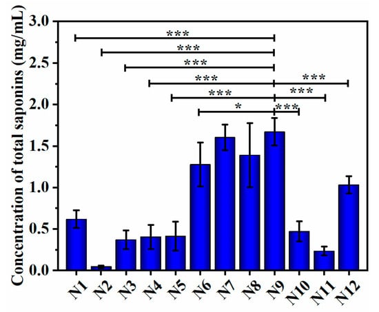 Concentration of total saponins in fermentation extracts by 12 uniform design protocols. N1–N12 protocols containing the six mixing levels (potato concentration, glucose concentration, inoculation volume, fermentation broth pH, incubation temperature, and incubation) in the uniform design experiment were designed using DPS software version 9.0. The concentration of total saponins by N1–N12 protocols was determined by the ultraviolet spectrophotometry method. Data are expressed as mean ± SD (n = 3). * p < 0.05, *** p < 0.001.