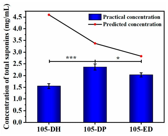 Concentration of total saponins in fermentation extracts by three optimization protocols. The optimal protocols 105-DH, 105-DP, and 105-ED for fermentation verification were obtained by multifactor and interaction term stepwise regression analysis, multifactor and square term stepwise regression analysis, and quadratic polynomial stepwise regression analysis. The predicted concentration of total saponins was calculated by DPS software 9.0. The practical concentration values are presented as means ± SD (n = 3). * p < 0.05, *** p < 0.001.
