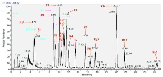 A mixed saponin standard solution with a concentration of 0.2 mg/mL was prepared, which consisted of the pseudo-ginsenoside F11, noto-ginsenoside Fe, noto-ginsenoside Ft1, and ginsenosides Rb1, Rb2, Rb3, Rc, Rd, Re, Rf, Rg1, Rg2, Rg3, Rh1, Rh2, Rk2, CK, F1, and F2. According to the total ion chromatogram (TIC) and mass spectrum (MS) analysis of each ginsenoside in the mixed saponin standards solution, the mass-to-charge ratio M/Z, peak time, and peak area of each substance were compared and analyzed with the database to determine the type and concentration of saponins [28].