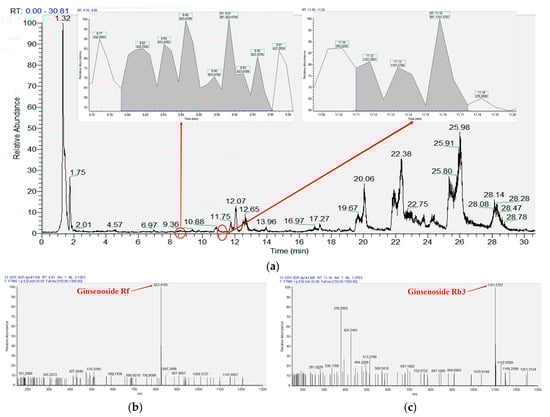 Determination and analysis of saponins. (a) TIC of LC–MS determination by 105-DP fermentation extract including partial enlargement of ginsenoside Rf and Rb3. (b) MS of ginsenoside Rf was 823.4795. (c) MS of ginsenoside Rb3 was 1101.5787.