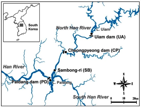 The Han River comprises two large tributaries (the North and South Han Rivers), covers an area of 26,000 km2, and is 5417 km long [19]. The North Han River flows into Paldang Lake, where there are major upstream and downstream dams. The last dam before the mainstream is the Paldang Dam, which is the main drinking water source for the region. In recent years, complaints regarding odorous compounds have increased near the North Han River, and high concentrations of odorous compounds have been reported [20].