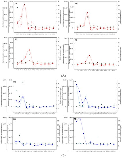 The three parameters, mic copy number, 2-MIB concentration, and cyanobacterial cell abundance, followed similar trends (Figure 3A). The trends in 2-MIB concentration and mic copy number were nearly identical, and the overall change in the 2-MIB concentration followed the change in the mic copy number more closely than the change in cell abundance. A previous study of three reservoir sites showed that trends in mic abundance closely followed the total 2-MIB concentration in many but not all samples [17]. The trends in 2-MIB concentration and cyanobacterial cell abundance were also roughly similar; however, at several sampling times within the UA and PD sites, both the mic copy number and the 2-MIB concentration were low, whereas the cyanobacterial cell abundance was high. In particular, at the PD site, when the 2-MIB concentration and mic copy number were low and the cyanobacterial cell abundance was high, cyanobacterial species that did not produce 2-MIB were dominant (Table S1).