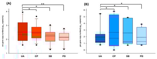 Figure 4 shows the ranges of the mic and geo copy numbers determined at the sampling sites during the study period. The UA site, the most upstream of the study monitoring points, has previously been reported to have high odorant concentrations [20] and was used as a control point to determine how these changed as the odorants moved downstream. For both genes, the copy numbers differed among the four sampling locations and decreased from upstream to downstream. In the t-tests, the copy numbers of the odorous genes were significantly different (p < 0.5 and p < 0.05) depending on their location in the stream. For mic, the copy number was highest (log1.59–log3.95 copies mL−1) at the most upstream site (UA) and progressively decreased downstream, such that the lowest copy number (log 1.29–log 2.48 copies mL−1) was detected at PD (Figure 4A). A similar pattern was observed for geo (Figure 4B), with the highest gene copy number (up to log 5.82 copies mL−1) detected at the upstream sites UA and CP and decreasing downstream.