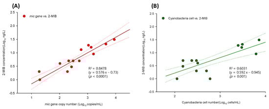 The relationships among gene copy number, 2-MIB/geosmin concentration, and cyanobacterial cell abundance were evaluated. Figure 5A shows the results of the log–log model and regression analysis of mic copy number and 2-MIB concentration. A positive linear correlation (R2 = 0.8478, p < 0.0001) was determined from the equation y = 0.576x − 0.73 (Figure 5A) and indicated that one mic copy corresponds to 4–50 fg of 2-MIB. A previous study [32] examined the correlation between mic copy number and 2-MIB concentration and found a log-linearity coefficient of 0.604 2-MIB (ng L−1) per mic copy in field samples, with 2-MIB production ranging from 11 to 57 fg per mic copy. Our microscopic analysis of 2-MIB concentration and cyanobacterial cell abundance (Figure 5B) showed a positive linear correlation between the two. However, as reflected by the correlation coefficient, R2 = 0.6031, the correlation was weaker than that between 2-MIB concentration and mic copy number.
