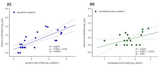 A comparison of cyanobacterial cell abundance and geosmin concentration (Figure 5D) showed a weak correlation (R2 = 0.2013, p = 0.05). Similarly, another study found no correlation between cell density and geo expression levels, as determined with qPCR [41]. The geosmin-producing cyanobacterial genus Anabaena was reported to be responsible for 46% of geosmin events [42], and the geosmin concentration was strongly correlated with Anabaena cell density (R2 = 0.97) [8]. In this study, the total cyanobacterial cell abundance and thus geosmin-producing and non-producing species were evaluated, explaining the weaker correlation between cyanobacterial cell abundance and geosmin concentration determined in this analysis.