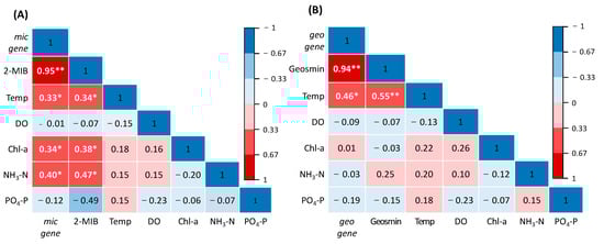 The odorant concentrations and gene copy numbers were compared to the levels of several environmental factors, including water temperature, dissolved oxygen, Chl-a, NH3-N, and PO4-P, using correlation analysis. As shown in the correlation matrix in Figure 6A, mic was positively correlated with 2-MIB concentration (R = 0.95, p < 0.01), water temperature, Chl-a, and NH3-N. A previous study showed the dependence of Pseudanabaena, the main 2-MIB producer, on Chl-a, CODMn, pH, and nitrogen levels [33]. It has generally been reported that high N and P levels support cyanobacterial growth [43]. A strong positive correlation was also found between geo copy number and geosmin concentration (R = 0.94, p < 0.01) (Figure 6B). However, in the environmental analysis, the only correlation was with water temperature (R = 0.46).