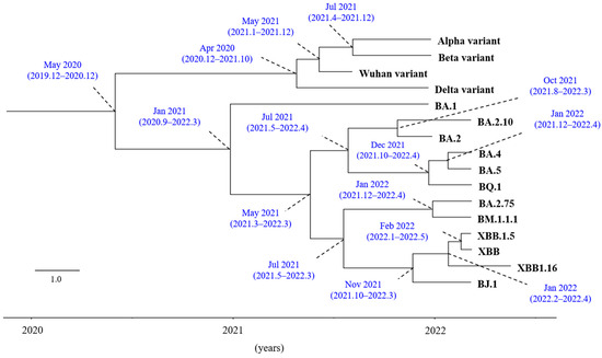 First, to estimate the time-scaled phylogeny of the S gene in the SARS-CoV-2 variants/subvariants, we constructed a phylogenetic tree using the BMCMC method (Figure 1). We found that a common ancestor of Omicron variants diverged from a common ancestor of the Wuhan, Alpha, Beta, and Delta variants in May 2020. Subsequently, a common ancestor of the Omicron variants diverged into the Omicron subvariants, including BA.1, BA.2, BA.4, and BA.5, over one year. Furthermore, the emergence of a common ancestor of Omicron XBB, BM.1.1.1, and BJ.1 occurred in July 2021. The evolutionary rate of the Omicron variants/subvariants was estimated to be around 3.4 × 10−3 substitutions/site/year, which is similar to other rapidly evolving viruses such as the influenza virus and norovirus [32,33]. Moreover, we also assessed the evolutionary rates of the S gene in SARS-CoV-2 strains except for the Omicron subvariant strains. We also found that no significance of these rates of the S gene was found between the present SARS-CoV-2 strains. The results suggest that the Omicron subvariants’ S gene rapidly evolved and generated many further subvariants, such as the XBB subvariants, within only 1 year. These findings may be compatible with previous reports [3,34].