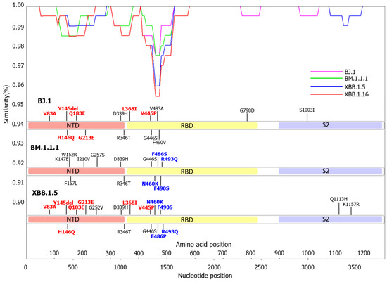 3.2. Similarity Plot Analysis of Omicron Subvariants BA.2, BJ.1, BM.1.1.1, XBB.1.5, and XBB.1.16