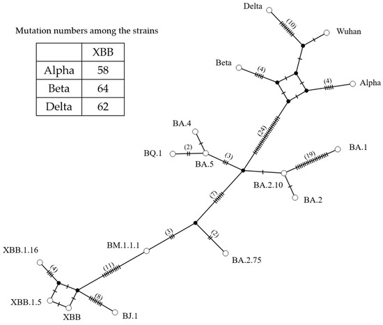 We also analyzed the genome network among the S genes in the SARS-CoV-2 variants/subvariants (Figure 3). Initially, an ancestor of the Omicron BA subvariant formed a genetic network with the Alpha variant through 24 nucleotide substitutions. Additionally, the ancestor of the Omicron BA subvariant also established a genetic network with the BA.2.75 subvariant through seven nucleotide substitutions. Furthermore, an ancestor of the XBB subvariant formed genetic networks with the BJ.1 and BM.1.1.1 subvariants through 7 and 11 nucleotide substitutions, respectively. The numbers of nucleotide substitutions between the S gene in the XBB and Alpha, Beta, and Delta were 58, 64, and 62, respectively. These results suggest that the Omicron XBB subvariant evolved by acquiring numerous nucleotide mutations from other variants, such as Alpha, Beta, and Delta, which acted as parental variants.