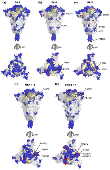 We mapped the conformational epitopes and amino acid mutations in BA.4, BA.5, XBB.1.5, and XBB.1.16 on the three-dimensional (3D) structure of the S proteins (Figure 4a–e). We also mapped amino acid mutations referring to a prototype of the BA.2 subvariant. Firstly, most conformational epitopes of all subvariants were located in the RBD. The number of epitopes was 11 in the XBB.1.5 and XBB.1.16 subvariants and 12 in the BA.2, BA.4, and BA.5 subvariants (Figure S1). Among these epitopes, common amino acid motifs were found. Notably, the XBB.1.5 and XBB.1.16 subvariants possessed specific amino acid mutations, such as V445P, G446S, N460K, and F486P, which were located in the RBD when compared with the BA.4 and BA.5 subvariants. Moreover, some representative immunogenicity-associated amino acid mutations, such as L452R, F486V, R493Q, and V490S, were found in these subvariants. These substitutions were involved in the conformational epitopes (Table 1), suggesting that these substitutions may reflect the immunogenicity and vaccine evasion. We also examined the relationships between 3D structures and conformational epitopes among BA.2, BA.2.10, and BA.2.75 (Figure S1). As a result, we found that the length of the epitope motifs between BA.2 and BA.2.10 were partly changed, while amino acid mutations did not change. However, four amino acid mutations between BA.2 and BA.2.75 were found. These substitutions also overlapped with the conformational epitopes.