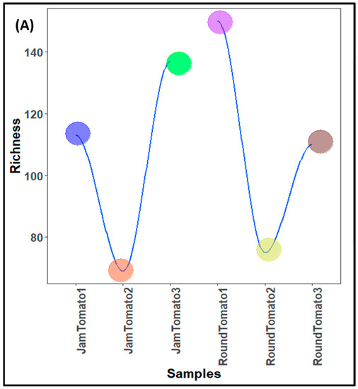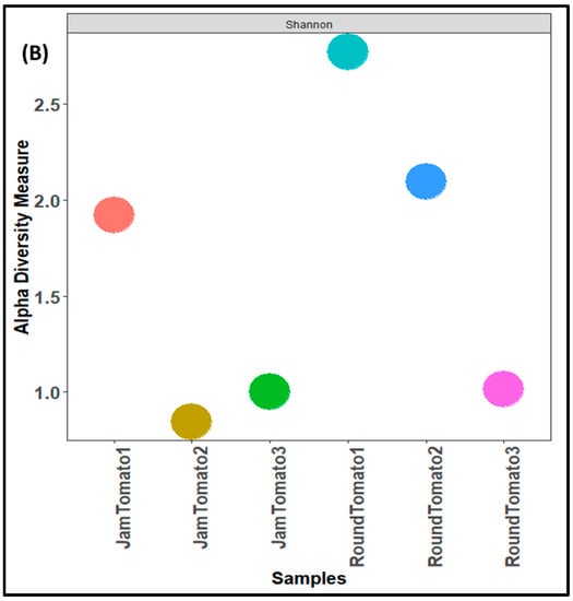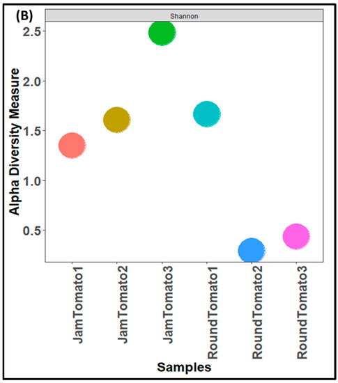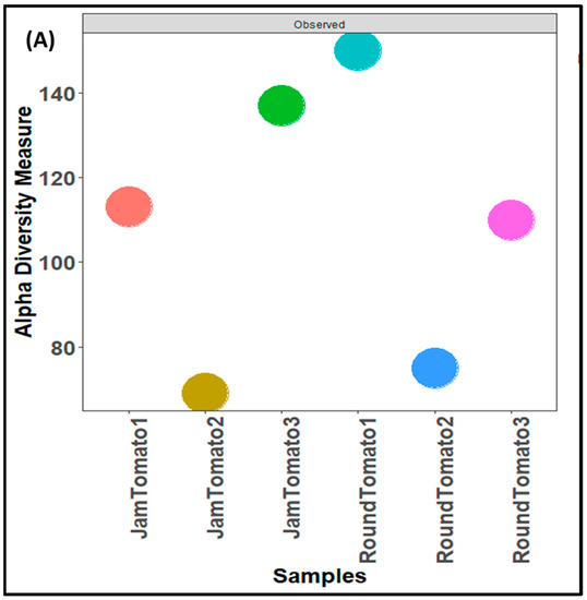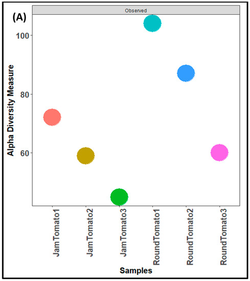 The results of bacterial richness and diversity between the two studied tomato cultivars as a function of three alpha diversity indices as shown in Figure 3. The observed alpha diversity index (Figure 3A) revealed that the species of jam tomato had the highest richness and abundance (number of taxa) on day 12 and the lowest abundance on day 6 (Figure 3A). While in round tomato the highest levels of richness and abundance were observed on day 1, this decreases drastically on day 6 and then increases slightly on day 12 (Figure 3A). Shannon alpha diversity, which measures distribution (evenness), showed higher diversity in day 12 jam tomato and day 1 round tomato followed by jam tomato day 6 and 1 and round tomato at day 6 and 12 (Figure 3B). The round’s diversity and richness decrease while the jam’s increase with storage time. Tomato fruits observed for bacteria on day 1 had Simpson’s diversity indices of 0.49 and 0.65, for jam and round tomato, respectively, while those observed on the 6th and 12th day had (0.72 and 0.08) and (0.85 and 0.12), respectively (Figure 3C). After 12 days of storage, none of these indices demonstrated significant differences in diversity richness between cultivars (p-values greater than 0.05).