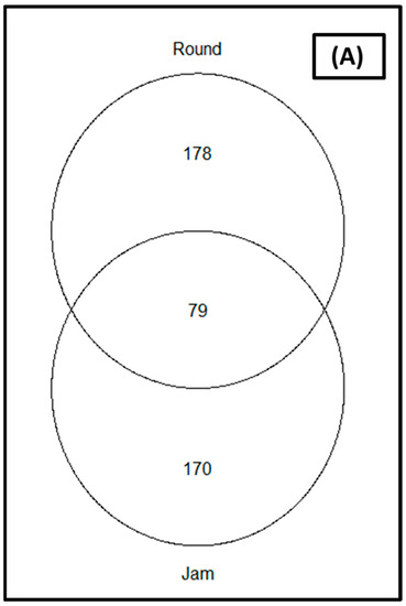 Venn diagrams showing the amplicon sequence variants (ASVs) shared between jam and round tomato for the (A) bacterial and (B) fungal communities. Only taxa with a relative abundance >1% in each cultivar are included.