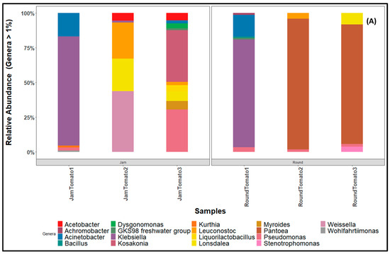 Bar charts revealing the relative abundance of (A) bacteria (B) fungi community structure at genus level across storage period for tomato cultivars (jam and round). JamTomato1 and RoundTomato1: day 1, JamTomato2 and RoundTomato2: day 6 and JamTomato3 and RoundTomato3: day 12.