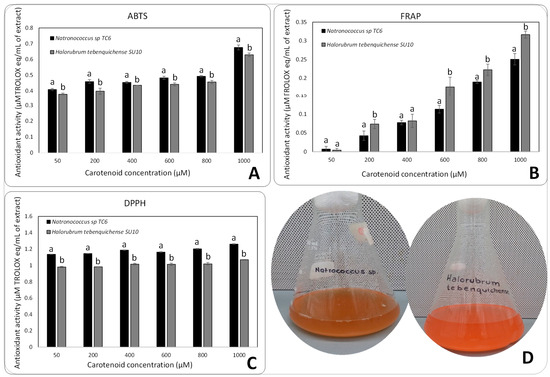 Antioxidant capacity of carotenoid extracts from Natronococcus sp. TC6 and Halorubrum tebenquichense SU10 tested for radical scavenging on DPPH, ABTS, and ferric ion-reducing antioxidant power (FRAP). (A) ABTS radical scavenging capacity of the carotenoid extracts. (B) Ferric ion-reducing antioxidant power (FRAP) of the carotenoid extracts. (C) DPPH radical scavenging capacity of the carotenoid extracts. (D) Pigmentation of strains Halorubrum tebenquichense SU10 and Natronococcus sp. TC6. Means with distinct letters represent statistical difference (p < 0.05) according to Fisher’s least significance difference (LSD) test related to the strain from which the pigment was extracted. Error bars represent Standard Deviation of three measures.
