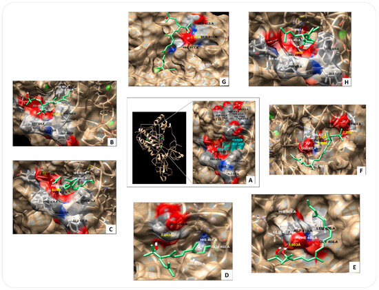 Docking assays of different archaeal carotenoid fragments over metalloproteinase 9 (MMP-9) (PDB: 1L6j). (A) MMP-9 catalytic pocket site. (B) Fragment 1 (bacterioruberin). (C) Fragment 2 (monoanhydrobacterioruberin). (D) Fragment 3 (bisanhydrobacterioruberin). (E) Fragment 4 (9-cis-26-cis-bacterioruberin). (F) Fragment 5 (9-cis-bacterioruberin). (G) Fragment 6 (13-cis-bacterioruberin). (H) Fragment 7 (trisanhydrobacterioruberin).