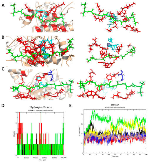 Molecular docking and molecular dynamics of bacterioruberin: (A) Binding site 1. (B) Binding site 2. (C) Allosteric Binding Site. Bacterioruberin colored in green, binding residues in red, active site in cyan, zinc in grey, Q108 in blue (a residue implicated in allosteric binding of an antibody reported by Appleby [29]). (D) H-bonds graph of the three binding sites analyzed for MMP-9 with bacterioruberin: Binding site 1 (black), Binding site 2 (red), and Allosteric Binding Site (green). (E) RMSD of MMP-9 and Bacterioruberin. MMP-9: Binding Site 1 (black), Binding Site 2 (green), and Allosteric Binding Site (yellow). Bacterioruberin: Binding Site 1 (red), Binding Site 2 (blue), and Allosteric Binding Site (brown).