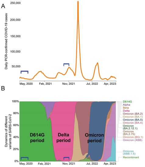 Between May 2020 and April 2023, Moscow experienced at least six waves of COVID-19 cases (Figure 1A). Whole-genome sequencing analysis data (available on the GISAID server https://www.gisaid.org, accessed on 10 July 2023) showed a succession of different SARS-CoV-2 genetic variants (Figure 1B). At the early stage of the pandemic, SARS-CoV-2 evolved rather slowly [] and throughout most of 2020 the B.1 variant was dominant. The B.1 spike protein differed from the Wuhan-Hu-1 isolate only by a single D614G mutation. At the turn of 2020 and 2021, the Alpha appeared briefly and the Beta VOC was also minimally present. At the beginning of 2022, all previous variants were completely replaced by the Delta (B.1.617.2) VOC. Various subvariants of Omicron have been establishing themselves in Russia since early 2022.