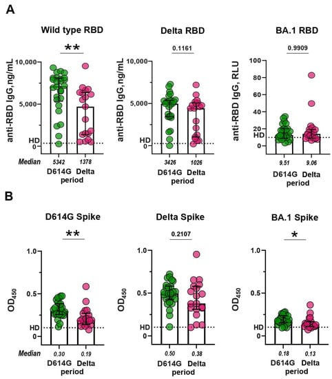 RBD- and S-binding activity of sera from patients with COVID-19 infected during the D614G and Delta periods. (A) Levels of serum IgG against WT, Delta, and BA.1 RBD, measured by ELISA. (B) Levels of serum IgG against WT, Delta, and BA.1 S protein, measured by mELISA. Dotted lines indicate the cut-off value for differentiating a positive response from a background response in the pre-pandemic samples from healthy donors (HD). ** p < 0.01, * p < 0.05.