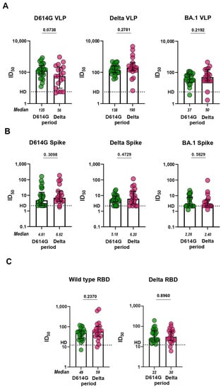 To investigate the functionality of antibodies from D614G and Delta periods, we proceeded to evaluate the serum virus-neutralizing activity in pVNA. First, we compared how sera neutralize VLPs pseudotyped with different spike variants. Sera from the D614G period neutralized VLPs bearing the S protein of either WT or Delta variant approximately equally and 3.7 times more potently than the BA.1-pseudotyped VLPs (p < 0.0001; Supplementary Figure S4). Sera from the Delta period neutralized VLPs pseudotyped with Delta S protein 3.5 and 3.9 times more effectively than WT- and BA.1-pseudotyped VLPs, respectively (p < 0.05, p < 0.01; Supplementary Figure S4). No significant differences between serum samples from D614G and Delta period were observed in the level of virus neutralization in pVNA for WT, Delta, and BA.1 variants (Figure 3A).