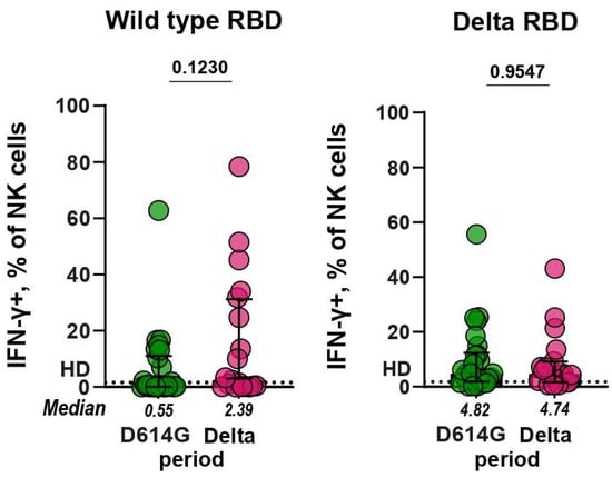 IFN-γ expression by NK cells in ADNKA. Plates were coated with wild-type (left panel) or Delta (right panel) RBD. NK cells were cultivated on plates in the presence of serum samples (dilution 1:40) from patients infected during D614G and Delta periods.