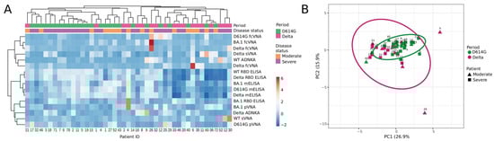 Hierarchical cluster (A) and principal component analysis (B) of serum samples from patients hospitalized with COVID-19 during D614G and Delta period. (A) Columns denote patients with their IDs. Rows correspond to immune response variables. Dendrograms on the top illustrate the clustering of patients. Immune response measurement values are color-coded according to the key shown on the right. (B) Principal component analysis of patients with COVID-19. Patient IDs are shown. D614G- and Delta-period clusters are indicated by the ovals. Results are shown for individual samples (symbols) from D614G period (n = 26) and Delta period (n = 19) patients.